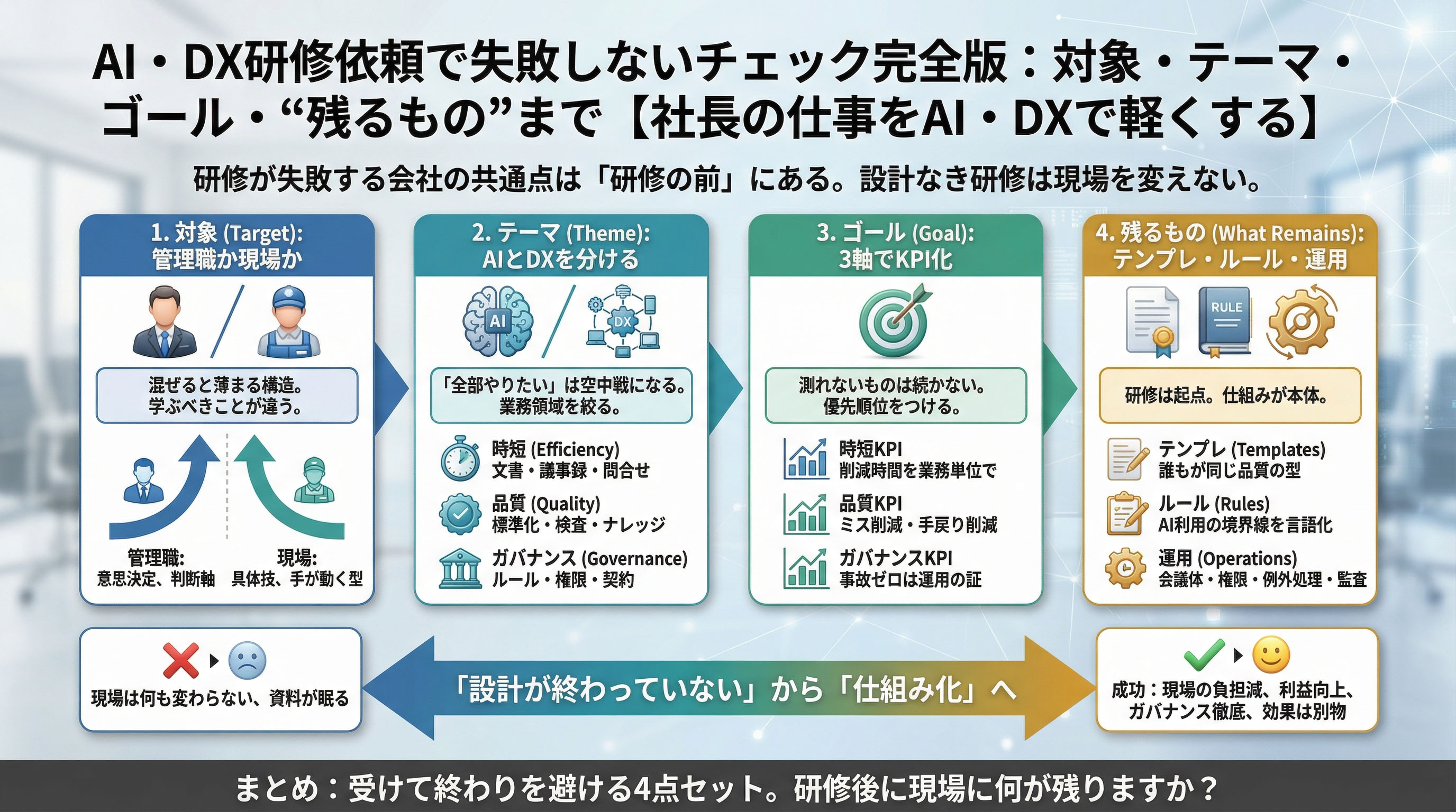 AI・DX研修依頼で失敗しないチェック完全版:対象・テーマ・ゴール・“残るもの”まで【社長の仕事をAI・DXで軽くする29】