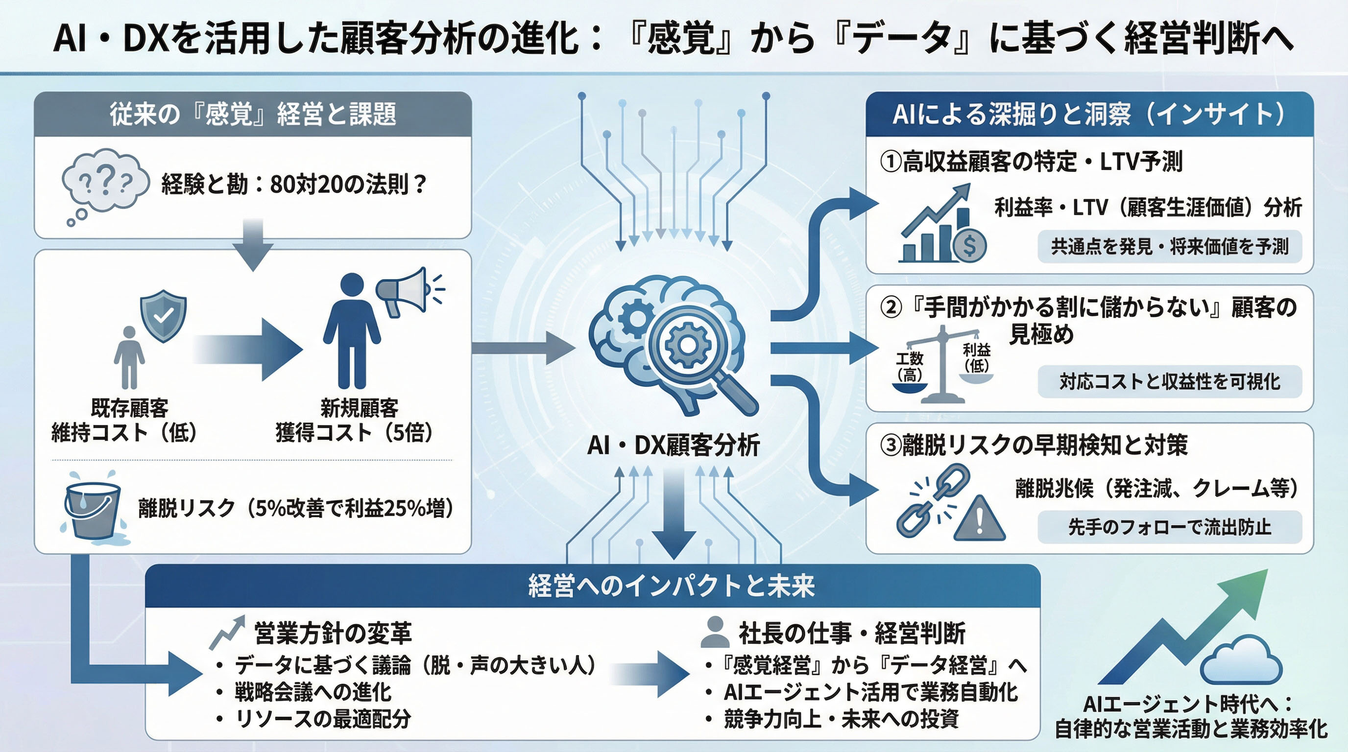 これらは、決して大企業だけの話ではありません。むしろ、リソースが限られる中小企業こそ、「感覚経営」から「データ経営」への転換が、競争力の源泉になるのです。限られた時間と人員で最大の成果を上げるためには、「どの顧客に、どれだけのリソースを投下すべきか」を、データに基づいて判断する必要があります。