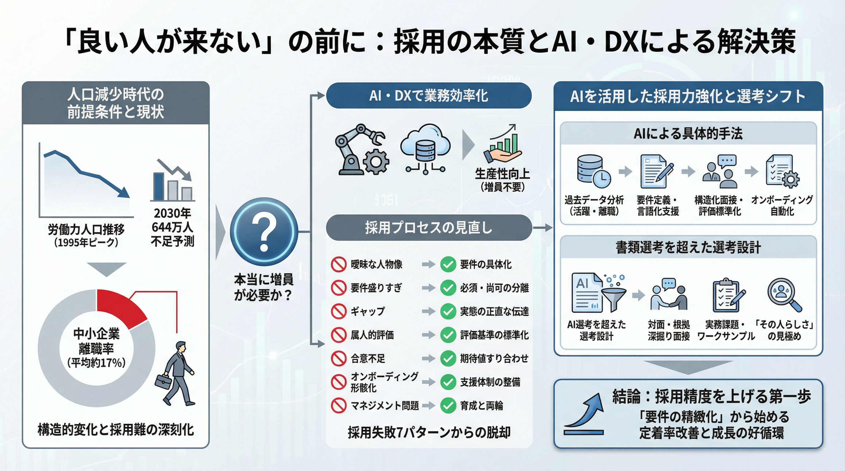 それでも採用が必要な場合は、AIを活用して採用精度を高める方法があります。過去データの分析による「成功人材モデル」の構築、書類選考や面接の標準化、オンボーディングの自動化——これらは中小企業でも十分に取り組めるテーマです。